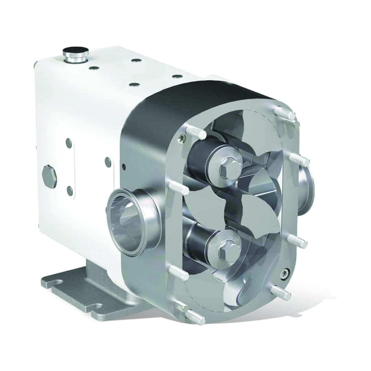 The first hybrid rotary lobe and circumferential piston pump with front loading seals.